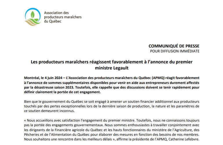 Les producteurs maraîchers réagissent favorablement à l’annonce du premier ministre Legault -